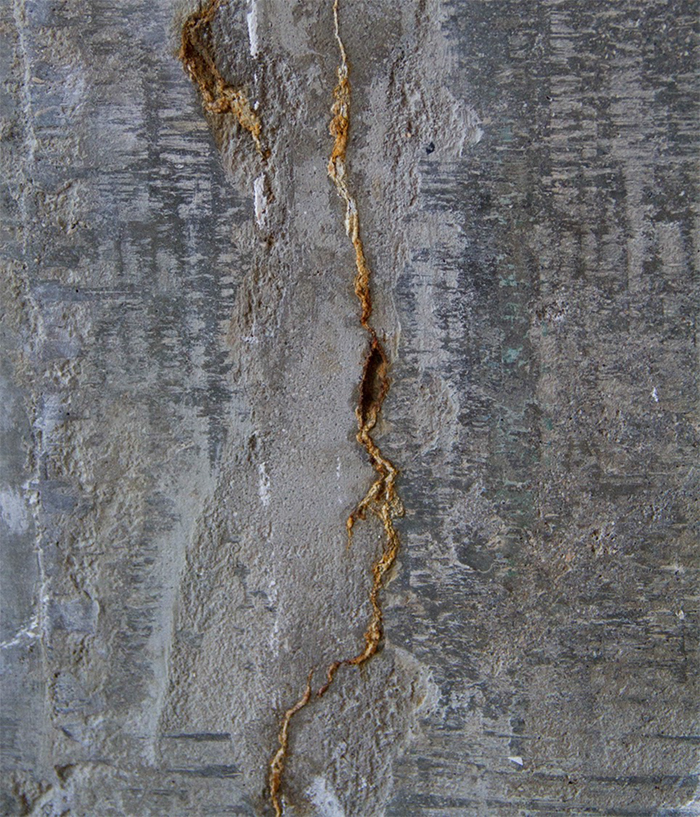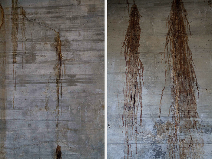 Infiltrações de ferrugem registradas nas paredes de concreto do MAM Rio Impressão em papel de algodão